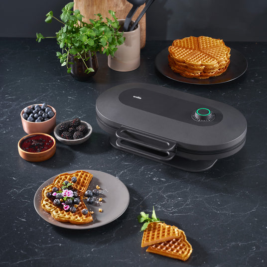 A Waffeleisen das die Hitze gleichmäßig verteilt, ist unerlässlich für perfekte Waffeln. Waffeln. Das Design spielt dabei eine große Rolle. Unser Waffeleisen verfügen über konisch geformte Platten und Lüftungsschlitze. Zusammen sorgen sie dafür, dass die Waffelteig gleichmäßig verteilt wird und überschüssige Luft entweicht - ein manuelles Verteilen mit einer Kelle ist nicht erforderlich!